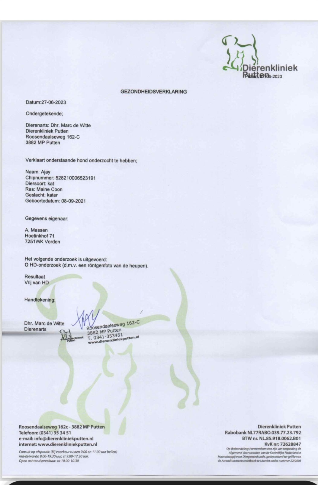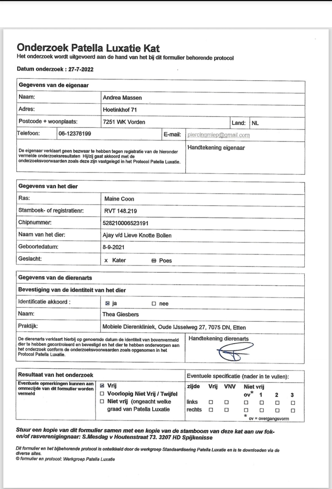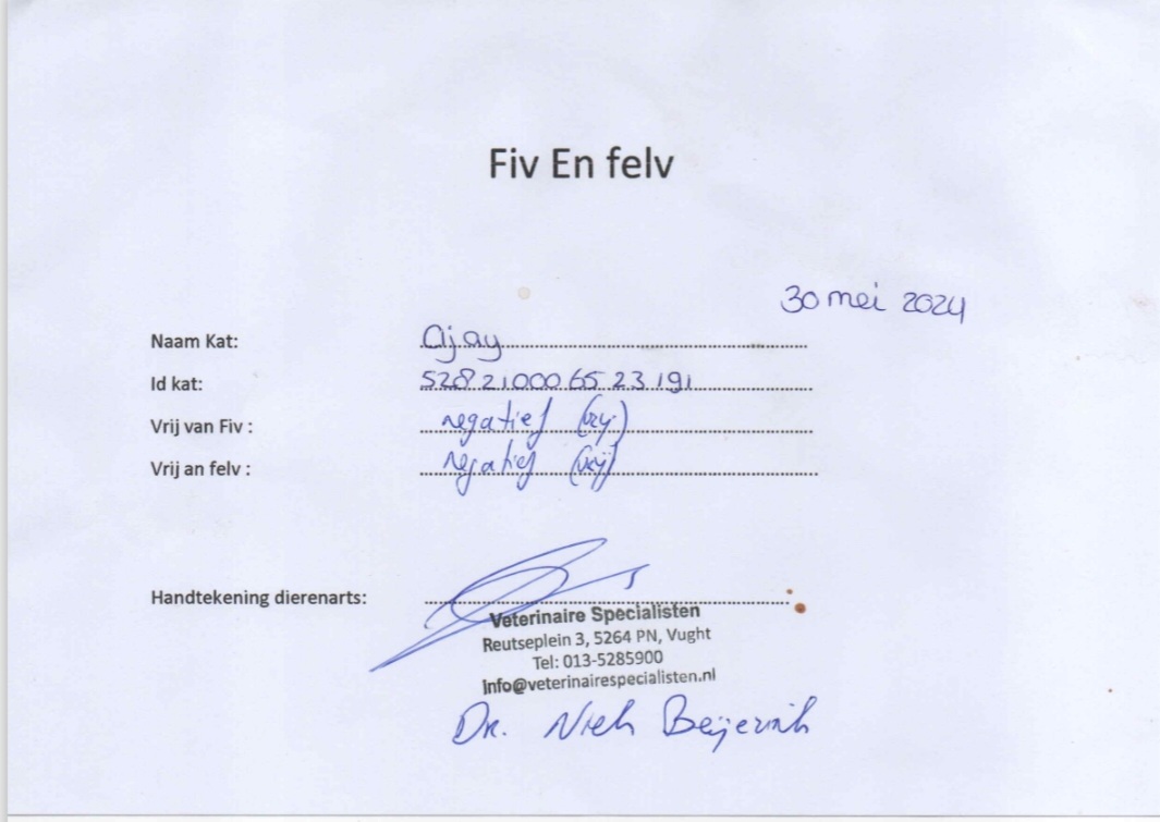 Beide ouders zijn getest op DNA, HCM, PKD, HD, PL, FIV en FELV.
