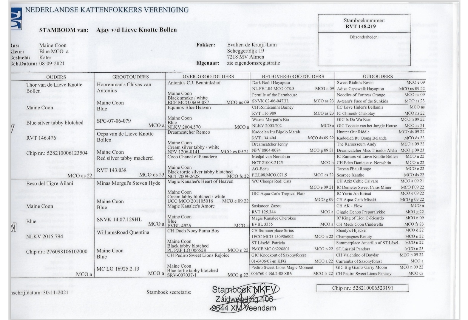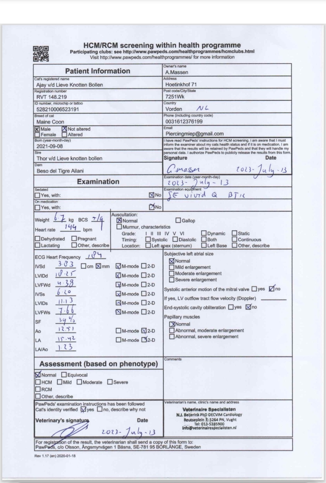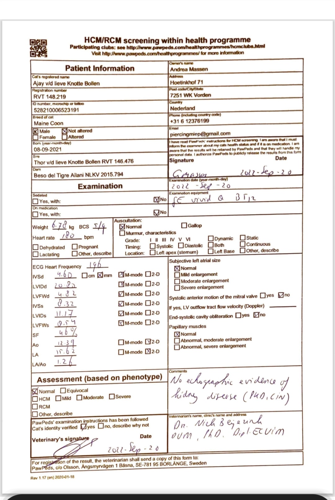 Beide ouders zijn getest op DNA, HCM, PKD, HD, PL, FIV en FELV.